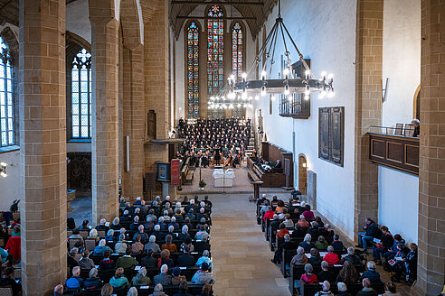 Im Jahre 1877 als Augustiner-Kirchengesangverein gegründet hat sich die Augustiner-Kantorei in der zweiten Hälfte des 20. Jahrhunderts zu einem übergemeindlichen und ökumenischen Chor entwickelt, dessen Mitglieder aus ganz Erfurt und dem Umland zusammenkommen. Seine Heimat hat der Chor im Augustinerkloster. Konzerte des Chores finden aber auch – je nach Jahreszeit – in der Prediger- und der Thomaskirche statt. In erster Linie beschäftigt sich die Augustiner-Kantorei mit der Einstudierung und Aufführung oratorischer Werke. Immer wieder finden sich z.B. die Passionen und Kantaten von Bach, Oratorien von Händel und Mendelssohn, das Requiem von Mozart, Messen von Schubert, Mozart, Dvorak, Bruckner usw. und aber auch weniger bekannte Kompositionen wie das Requiem von Maurice Duruflé, das Gloria von Vivaldi oder Carl Martin Reinthalers Oratorium „Jephta und seine Tochter“ auf dem Programm. Auch Musik des 20./21. Jahrhunderts gehört zum Repertoire: Viel Freude hat 2015 sowohl Ausführenden als auch Zuhörern die „Misa Tango“ des argentinischen Komponisten Martin Palmeri gemacht. 2017 fand anlässlich des 500-jährigen Reformationsgedenkens die Uraufführung des „Enchiridion-Echo“ des Magdeburger Komponisten Thomas König statt. Seit über 50 Jahren führt der Chor alljährlich das Weihnachtsoratorium von Johann Sebastian Bach auf, ein nicht wegzudenkender Fixpunkt im Musikleben der Landeshauptstadt. Seit dem Jahr 2000 ist die Kantorei regelmäßig an der Reihe der Bach-Kantaten-Gottesdienste beteiligt. Auch bei Rundfunk- und Fernsehgottesdiensten hat die Augustiner-Kantorei mitgewirkt. Wichtig für die musikalische Entwicklung und das menschliche Miteinander sind auch die Probenwochenenden. Konzertreisen führten die Kantorei in diverse deutsche Städte, 2016 nach Japan (siehe linker Seitenstreifen) und 2019 nach Großbritannien. 2003 wurde im Zusammenwirken mit KMD Prof. Matthias Dreißig die CD „Laudes organi“ mit Werken für Chor und Orgel von Mendelssohn, Gárdonyi, Peeters aufgenommen. Die CD Thomas König „Enchiridion-Echo“ ist über Mitglieder der Kantorei und an der Rezeption des Augustinerklosters erhältlich. | |