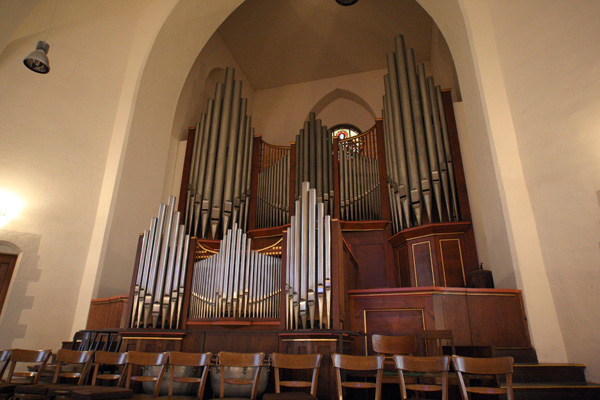 1950 Einweihung der wiederaufgebauten Kirche mit dem 1. Bauabschnitt der neuen Orgel: Hauptmanual und 8 Pedalstimmen, sowie einem provisorischen Spielschrank